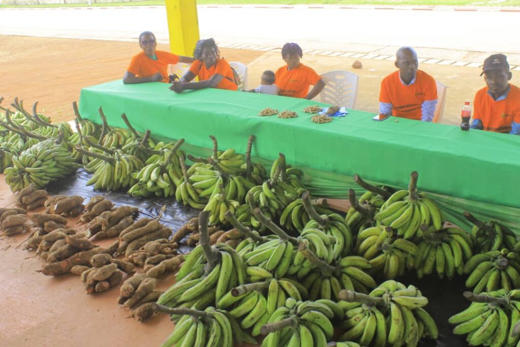 Au total, 16 coopératives ont pris part à cette foire, représentant les villages partenaires de Mboukou, Rembo, Ferra, Iroungou, Nanga, Nyanga-Youngou, et plusieurs coopératives sœurs de la commune de Mouila. Les exposantes ont présenté une grande diversité de produits vivriers locaux, agrumes et PFNL : bananes, manioc, asperges, feuilles de manioc, ananas, mangues, légumes-feuilles, curcuma, patates douces, citronniers, pamplemoussiers, etc.